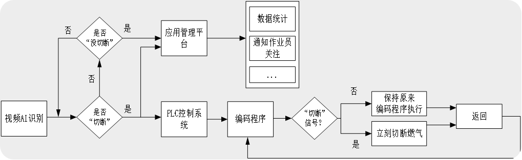 九九智能環(huán)保AI識(shí)別的氫氧火焰切割系統(tǒng),通過(guò)視頻AI分析,判斷切斷的時(shí)刻,通過(guò)報(bào)警輸出對(duì)接PLC控制系統(tǒng),PLC控制系統(tǒng)收到切斷的電平信號(hào)后,立即關(guān)閉切割氣體,(但為了保證能切斷,也可保留一定的延時(shí),如縮短到延時(shí)2秒內(nèi)全關(guān)閉),可有效節(jié)約燃?xì)獾睦速M(fèi)。如果PLC一直沒(méi)收到切斷電平信號(hào)則繼續(xù)執(zhí)行原來(lái)PLC編碼器的方案,以保證產(chǎn)線正常生產(chǎn)。