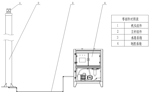 霧樁由機頭組件、立桿組件、水路系統(tǒng)、電控系統(tǒng)四部分組成。